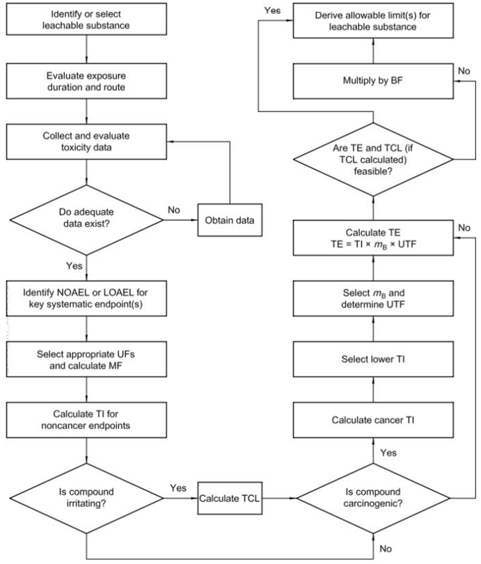特定的可瀝濾物的總?cè)菰S限值可以由三部分組成:即短期限值、延長(zhǎng)限值和壽命限值。所以,可能需要考慮多種暴露途徑下每種限值的情況。為此,針對(duì)每種使用類別中的每種接觸途徑,分別計(jì)算容許攝入量(TI)。在很多情況下,允許將最低TI值用于不同的使用類別和暴露途徑,這樣最能代表可瀝濾物的毒理作用。