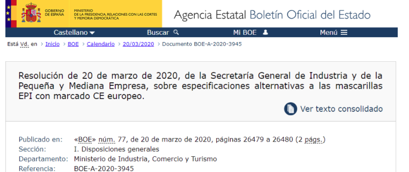 針對新冠肺炎疫情期間帶CE標識的個人防護用品市場短缺的現狀,近日,西班牙工業和中小企業部發布決議,公布中國口罩相關標準可替代歐洲標準。