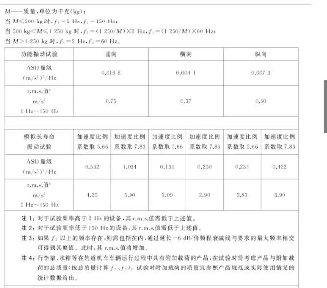 ——功能振動試驗,施加最小的試驗量級,驗證被測設備在軌道機車車輛上可能的環境條件下能否正常工作,是否滿足制造商和用戶的雙方性能需求;——模擬長壽命試驗:證實在加速運行振動量級條件下設備機械結構的完好性,在試驗時候不必檢查設備的功能。