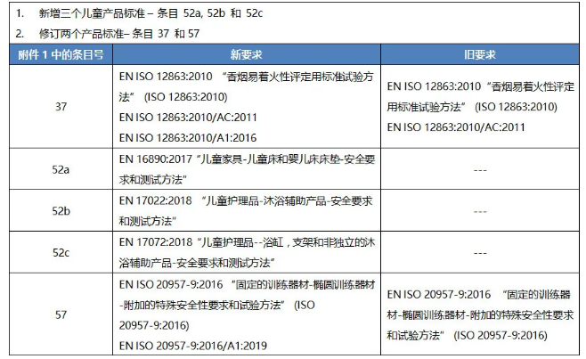 2020年12月1日,歐盟在其官方公報公布決議(EU)2020/1808,以修訂(EU)2019/1698附件1的標準清單。該清單為支持《通用產品安全指令》(2001/95/EC)而起草的協調標準清單。