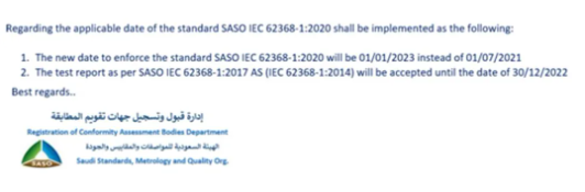 IEC 62368-1: 2018 (即SASO IEC 62368-1:2020) 的強(qiáng)制執(zhí)行日期延后至2023年1月1日 ,也就是自2023年1月1日起將不再接受IEC 62368-1:2014第二版的CB證書與報(bào)告,只接受IEC 62368-1:2018(第三版)的CB證書與報(bào)告 。
