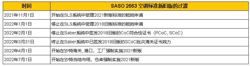 2021年8月23日,沙特標(biāo)準(zhǔn)局SASO正式公告了空調(diào)能效 SASO 2663新舊版標(biāo)準(zhǔn)的執(zhí)行過(guò)渡期,請(qǐng)相關(guān)廠商關(guān)注標(biāo)準(zhǔn)執(zhí)行的重要時(shí)間點(diǎn),盡快在標(biāo)準(zhǔn)過(guò)渡期內(nèi)完成新標(biāo)準(zhǔn)測(cè)試并及時(shí)更新能效證書。