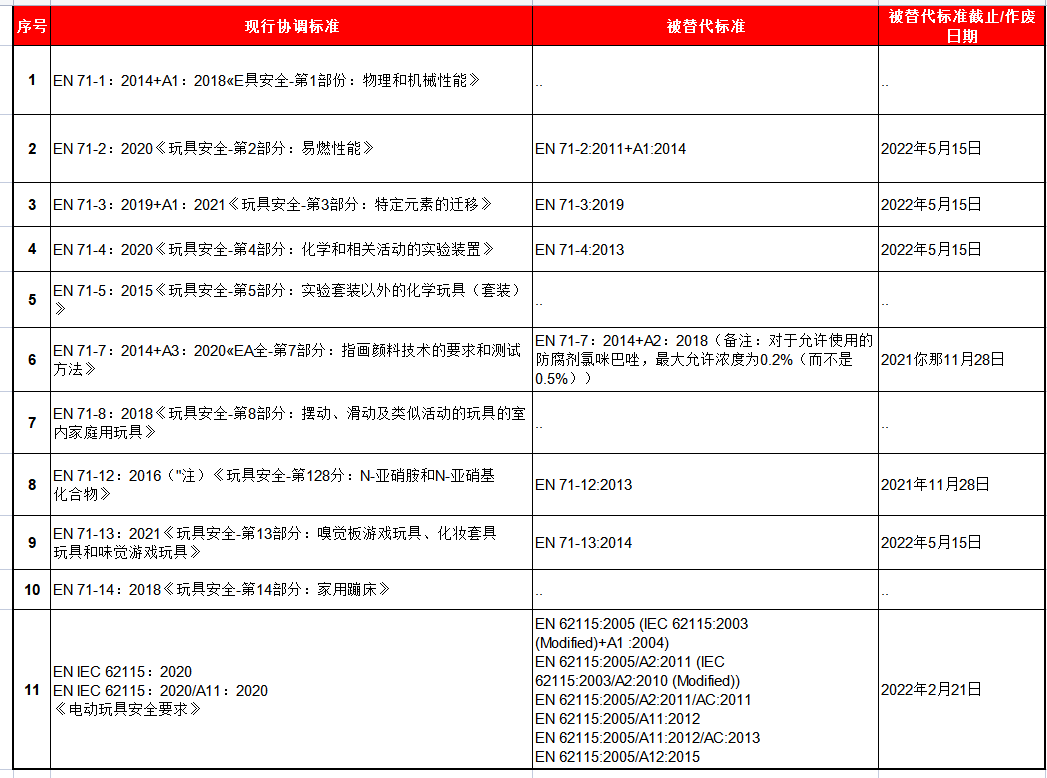 結合2021年5月31日更新的EN 71-7、EN 71-12和EN IEC 62115三項協調標準后,最新的歐盟玩具安全指令(2009/48/EC)協調標準總結如下表: