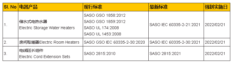 2021年11月9日,沙特標(biāo)準(zhǔn)、計(jì)量和質(zhì)量組織 (SASO)向所有合格評(píng)定機(jī)構(gòu)發(fā)出正式通告,要求實(shí)施2021年8月20日發(fā)布在沙特政府公報(bào)(Umm Al-Qura Gazzite)第4896號(hào)文件中提及的部分電器國(guó)家強(qiáng)制性標(biāo)準(zhǔn)修訂案。