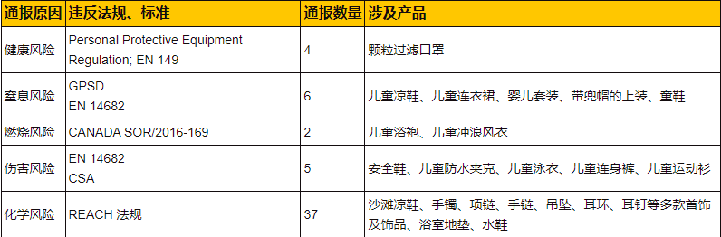 歐盟市場物理類召回14例,其中4例因為口罩過濾能力不足,因此過量的微?;蛭⑸锟赡軙┻^口罩,可能增加感染風險并造成健康風險;4例為兒童防水夾克、兒童泳衣、兒童連身褲及兒童運動衫設(shè)計不合理,可能對兒童造成絞勒傷害風險;6例為帶兜帽的上裝、兒童涼鞋、童鞋、兒童連衣裙、嬰兒套裝設(shè)計不合理,存在小部件可能導(dǎo)致兒童窒息的風險。