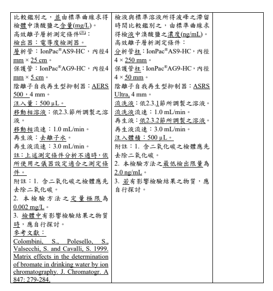 2022年5月23日,臺灣衛福部食藥署發布衛授食字第1111900735號公告,預告修正「包裝飲用水及盛裝飲用水中溴酸鹽之檢驗方法」草案。 其修正要點如下:
